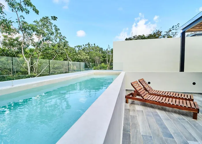 De gesitueerde in Tulum Pueblo Luxury Villa With 2 Pools, Open Terraces And Sun Deck Tulum Pueblo bevindt zich op korte rijafstand van 10 minuten van Playa Paraíso en beschikt over een patio met uitzicht op de binnenplaats. Deze 3-badkamer villa ligt in de La Veleta wijk en biedt gasten de kans om te ontspannen in een dakzwembad.